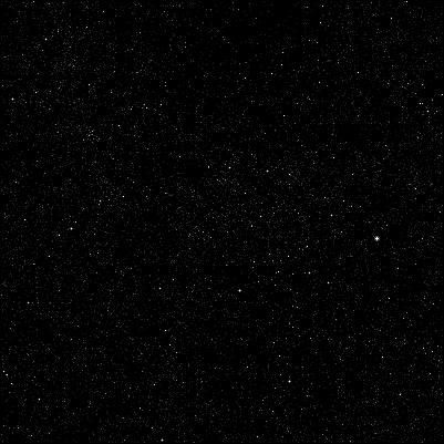 My next target was the Ring Nebula, M57. This time, I knew the approximate error that I had gotten when attempting to find M27, so I tried to take that into account. This time, the setting circles got me within about a half-degree of M57, so it was sitting right at the very edge of my main field of view, toward the southwest. A few turns of the fine controls were sufficient to bring it back to the middle of the field. (Here's a finderscope view (6.5 degree FOV) of where M57 is. Stars shown to about magnitude 9. Again, north is up, east is left. Coordinates are RA 283.4, Dec 33.0.)