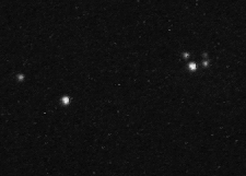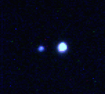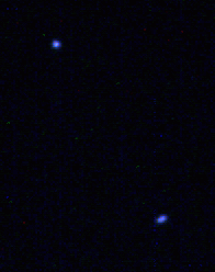 Another common celestial rest stop is M42, the Orion Nebula. From my site, M42 is actually a subtle puff of smoke, not at all the magnificent O'Keefian splendor you see in coffee table books, but the Trapezium, the quadruplet of stars at the heart of M42, stands out quite well. (The Trapezium (theta1 Orionis) is actually a small cluster that includes at least five or six other stars within the range of reasonably sized amateur scopes.) Here we see the four main stars of the Trapezium, as well as the two wider stars of theta2 Orionis.