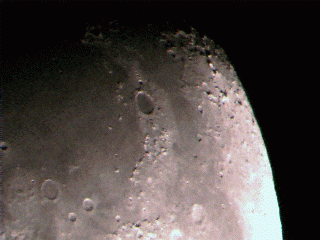 There's nothing out of the ordinary with this shot—in fact, the seeing was pretty bad, with Jupiter swelling to a one-and-a-half arc minute blob—but it was the first shot that I took with my fully portable set-up. (See the imaging page for more details.) The prominent crater at center is Plato. A common test of optics plus good seeing is to try to find the craterlets inside Plato. The biggest are a couple of kilometers wide or so.