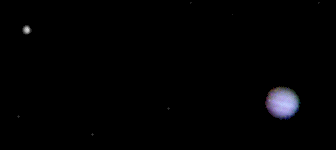 A night of very good seeing (about 8 on a scale of 0 to 10) produced this decent image of Jupiter. The image of Ganymede at left has been artificially brightened. Unseen in this image was a nice view of dark Callisto passing across the southern extremity of Jupiter. Io and Europa were behind the disc at the time this picture was taken, in a double eclipse. North is up, east is left.