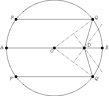These three rays, after reflecting off the right semicircle, intersect the line AB at a point D, which can be constructed straightforwardly. Simply draw the perpendicular bisectors of OQ and OQ'. These will both intersect AB at D. The following diagram should make this clear: