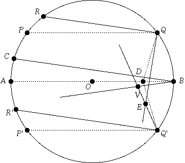 Next, let's consider what happens to these three rays if they are still parallel, still strike the right semicircle at Q, B, and Q', but are no longer horizontal. Let's call these three new rays, RQ, CB, and R'Q'. We shall see that the reflections of these three new rays no longer intersect at one point. If we follow the reflection of R'Q', we see in Figure 2 that it intersects the reflection of RQ at E, then intersects the reflection of CB at V.