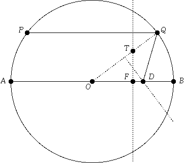 Now, let's consider what happens if we return to the horizontal rays, but move PQ and P'Q' steadily closer toward the diameter AB. In that case, the point D steadily moves toward the point F, halfway between O and B, which is the nominal focal point of the mirror. In fact, from the above discussion, D is precisely as far from O as is the point T, which is the the point on OQ directly above F. (See Figure 4.)