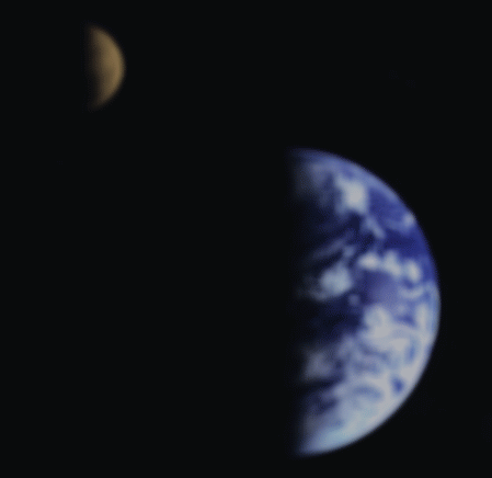 What I've done here is taken a fairly natural image (I think) of our planet and its satellite, recorded by the Galileo satellite on its way to Jupiter and its satellites, and blurred it by an amount that represents the effect of diffraction in, say, an 8-inch (203 mm) telescope. What's most evident here is the intense blueness of our world (by far the bluest in the solar system), and the dimness of our Moon, when compared to the Earth. Imagine the glare presented by the Earth in the Moon's nighttime sky at new Moon!