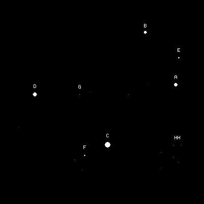 Stars G and HH (a double) are about 16th magnitude and can only be seen in the largest amateur telescopes, probably at least 16 inches or larger.